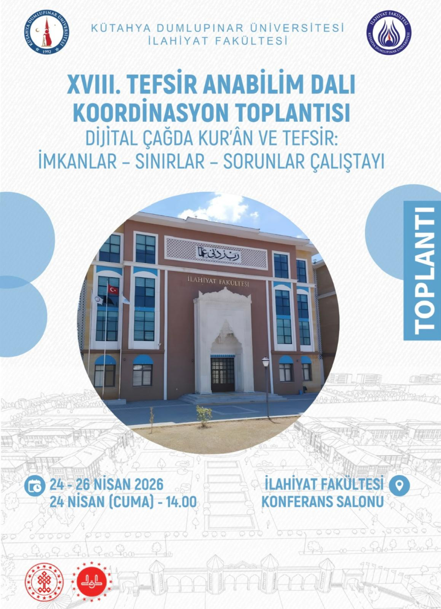 سيُعقد الاجتماع التنسيقي الثامن عشر لأكاديميي التفسير، الذي تنظمه كلية الإلهيات بجامعة كوتاهيا دوملوبينار، في مدينة كوتاهيا خلال الفترة ما بين 24–26 أبريل 2026.