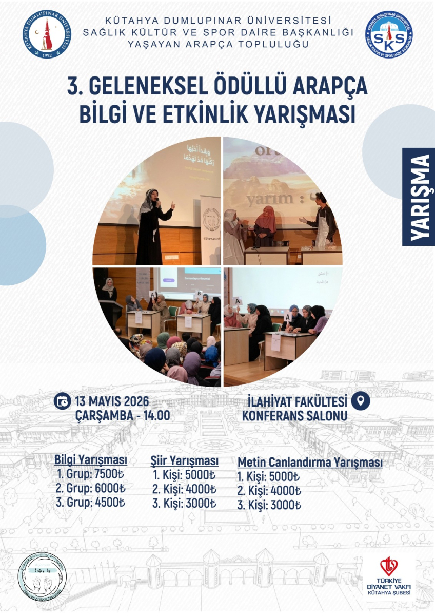 Üniversitemiz Sağlık Kültür ve Spor Daire Başkanlığı bünyesinde faaliyet gösteren Yaşayan Arapça Topluluğu tarafından düzenlenecek olan 3. Geleneksel Ödüllü Arapça Yarışmalarına katılımlarınızı bekliyoruz.